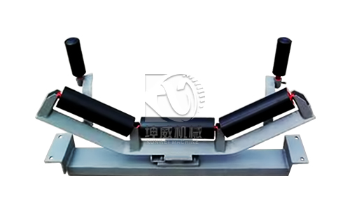 皮帶輸送機糾偏方法很多,最常用和最有效的方式是采用調心托輥。調心托輥的結構多種多樣,調偏方式也不盡相同,但工作方式大致相同,即當輸送帶跑偏時帶動調心托輥組發生偏轉,使托輥產生一個促使輸送帶恢復平衡位置的摩擦力,從而達到輸送帶糾偏的目的。常見的調心托輥有TD75型槽形調心托輥、DTⅡ型錐形調心托輥等。